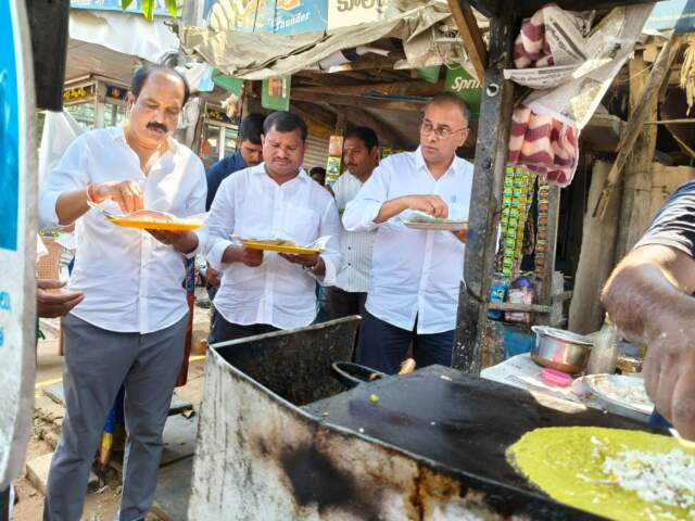 అశ్వారావుపేట: హంగు ఆర్భాటానికి దూరంగా ఉంటూ.. ఎల్లప్పుడూ ప్రజలతో మమేకమయ్యే ఖమ్మం ఎంపీ రామ సహాయం రఘురాం రెడ్డి.. సోమవారం ఉదయం రోడ్డు వెంట టిఫిన్ బండి వద్ద దోస తిన్నారు. అశ్వారావుపేట నియోజకవర్గం లో అభివృద్ధి పనులకు శంకుస్థాపన చేసేందుకు.. స్థానిక ఎమ్మెల్యే జారే ఆదినారాయణతో కలిసి వెళుతూ..పోలీస్ స్టేషన్ రింగ్ సెంటర్ లో ఆగారు. రోడ్డు వెంట ఉన్న టిఫిన్ బండి వద్దకు ఓ సామాన్యుడి మాదిరి గా వెళ్లి హాఫ్ దోస, సింగల్ ఇడ్లీ తినగా.. సార్ భలే సింపుల్ అంటూ స్థానికులు ఒకిoత ఆశ్చర్యంగా చూశారు. అక్కడున్న.. స్థానిక ఆదివాసీ యువతను ఆప్యాయంగా పలకరించగా..వారంతా ఎంపీ తో సెల్ఫీలు తీసుకుని ఆన%B