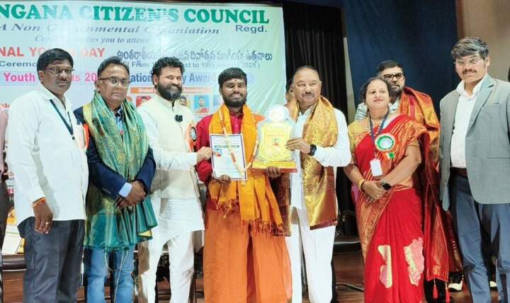 ప్రదానోత్సవ కార్యక్రమంలో భాగంగా, 2025 సంవత్సరానికి గాను గ్లోబల్ ఐకాన్ యూత్ అవార్డ్ ను పౌరోహిత్యం విభాగంలో శివ శాస్త్రి అందుకున్నారు. కోటగిరి మండలానికి చెందిన పూజారి శివ శాస్త్రి గ్లోబల్ ఐకాన్ యూత్ అవార్డుకు ఎంపిక అవ్వడంతో ఆయనను ఉమ్మడి కోటగిరి మండలం ప్రెస్ క్లబ్ ఆధ్వర్యంలో బుధవారం ఘనంగా సన్మానించారు. ఆయనకు అవార్డు దక్కడంతో అభినందిస్తూ శాలువా పూలమాలలతో సన్మానించి స్వీట్లు తినిపించారు. ఈ సందర్భంగా పూజారి శివ శాస్త్రి మాట్లాడుతూ…. గ్లోబల్ ఐకాన్ యూత్ అవార్డుకు పౌరోహిత్యం విభాగంలో ఎంపిక కావడం సంతోషంగా ఉందన్నారు. తాను చేస్తున్న పౌరహిత్యానికి గుర్తింపుగా తనను గ్లోబల్ ఐకాన్ యూత్ అవార్డుకు ఎంపిక చేసిన తెలంగాణ సిటిజన్ కౌన్సిల్ సభ్యులకు, తనను ఘనంగా సన్మానించిన కోటగిరి ప్రెస్ క్లబ్ సభ్యులకు ధన్యవాదములు తెలిపారు. తాను చిన్నప్పటినుండి పౌరోహిత్యం చేయడానికి సహకరించిన యాద్గార్పూర్ గ్రామస్తులకు, తనకు వేదం నేర్పిన గురువులకు ఈ అవార్డు అంకితం అని ఆయన చెప్పారు. తనకు చిన్నప్పటినుండి సహకారం అందిస్తున్న యాద్గార్పూర్ గ్రామస్తులకు కృతజ్ఞతలు తెలిపారు.ఈ కార్యక్రమానికి హాజరైన ప్రముఖులలో తెలంగాణ సిటిజన్ కౌన్సిల్ వ్యవస్థాపకులు డాక్టర్. రాజ్ నారాయణ , ముఖ్య అతిథుతులుగా డిప్యూటీ చైర్మన్ ఆఫ్ తెలంగాణ లెజిస్లేటివ్ కౌన్సిల్ సభ్యులు డాక్టర్.బండ ప్రకాష్, రాష్ట్ర మాజీ మంత్రివర్యులు జీ. వివేకానంద్, కోటగిరి ప్రెస్ క్లబ్ అధ్యక్షుడు సాయిబాబా గౌడ్, ఉపాధ్యక్షులు కృష్ణ, గౌరవ అధ్యక్షులు రాము, కోశాధికారి అనిల్, యాద్గర్పూర్ గ్రామస్తులు హనుమంతు, వినోద్ తదితరులు పాల్గొన్నారు.