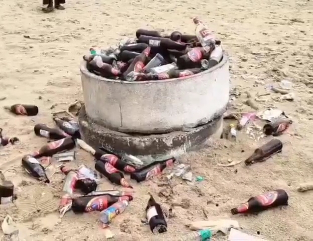సముద్ర తీరప్రాంతంలో మద్యం సీసాలు, ప్లాస్టిక్ కవర్లు, తినుబండారాల బాక్స్లు చెల్లాచెదురుగా పడివుండటంతో అందమైన బీచ్ దృశ్యం చెడిపోయింది. పర్యావరణానికి హాని కలిగే ఈ పరిస్థితిని చూసి స్థానికులు ఆగ్రహం వ్యక్తం చేస్తున్నారు.