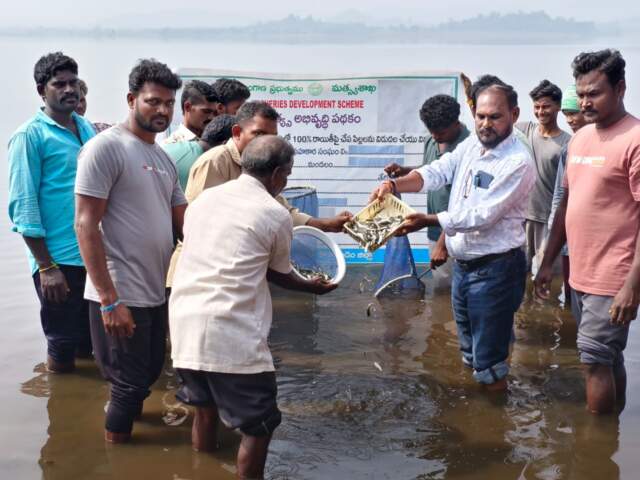 అశ్వాపురం : మండలం లో ఈ రోజు మత్స్యకారులకు జిల్లా మత్స్యశాఖ అధికారి ఇoతియాజ్ మరియు ఇరిగేషన్ శాఖ డీఈ బి రమేష్ చేప పిల్లలను పంపిణీ చేసి కాకతీయుల కాలం నాటి తుమ్మల చెరువులో వదిలారు ఈ నేపథ్యంలో వారు మాట్లాడుతూ మత్స్యకారులను ఆర్థికంగా బలోపేతం చేసేందుకు ప్రభుత్వం ఉచిత చేప పిల్లల పథకం మత్స్య వృత్తిదారులకు ఎంతో ఉపయోగపడుతుందన్నారు. చేపల పెంపకం మత్స్యకారుల ఆర్థికాభివృద్ధికి ప్రభుత్వం ఈ పథకాన్ని తీసుకొచ్చినట్లు తెలిపారు.
